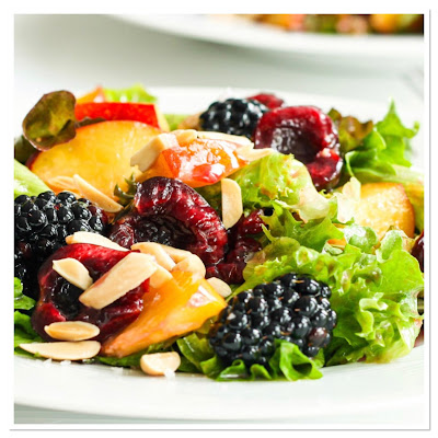 This recipe celebrates summer's bounty of fruits. Think nectarines, cherries, and blackberries on red and green leaf lettuce. The dressing is a honey white balsamic vinaigrette. I follow Sydne on Facebook, and you should too.